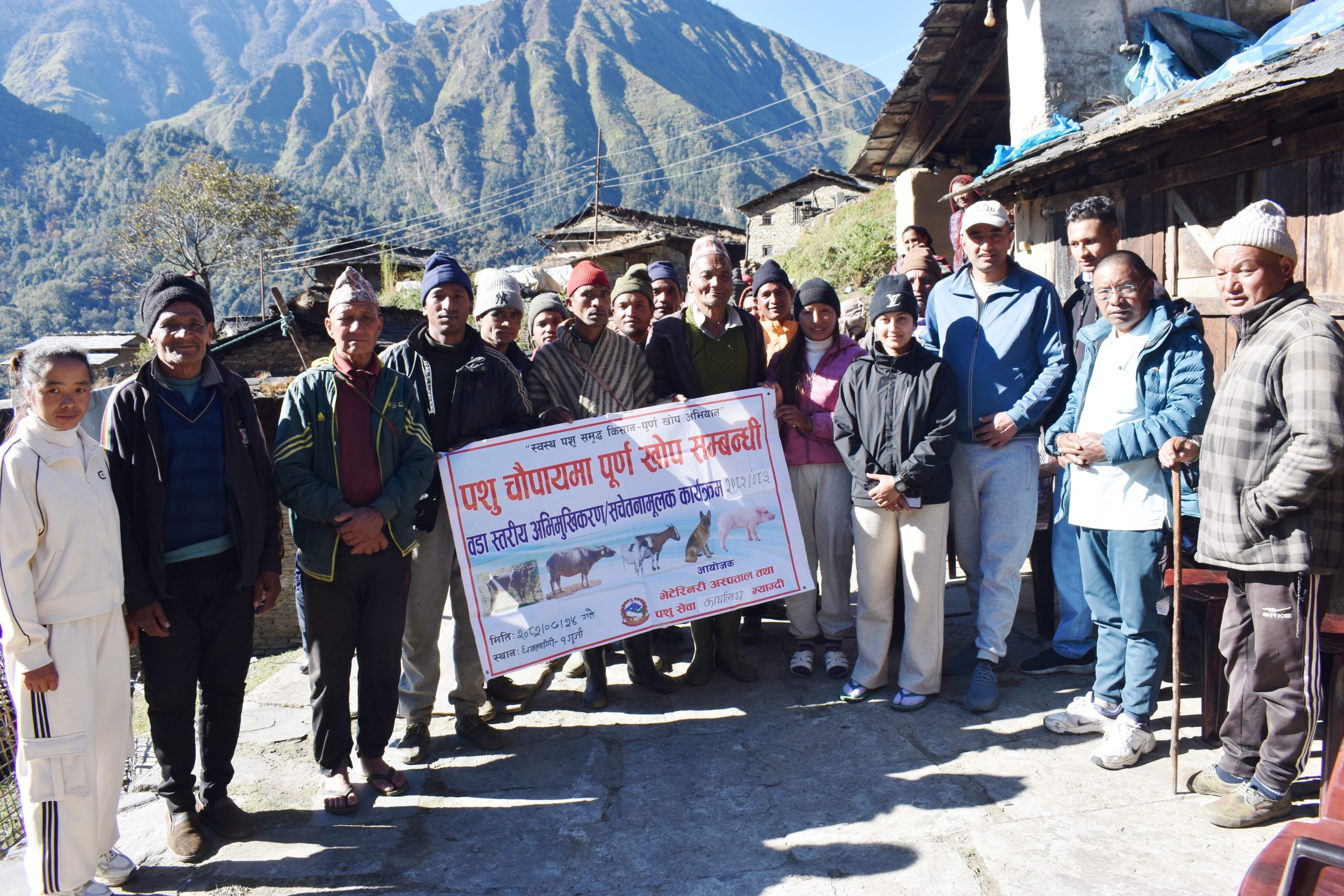 स्थानीय किसानहरुले पालेका पशु चौपायालाई रोग लाग्नबाट सुरक्षित राखी उत्पादन वृद्धि गर्ने उद्देश्यका साथ पशु चौपायामा पूर्णखोप सम्बन्धी विषयमा अभिमुखीकरण तथा सचेतनामूलक कार्यक्रम सञ्चालन गरिएको आयोजकले जनाएको छ । रोग लागेर पशु चौपायाको क्षति नहोस् भनेर पशुपालक किसानहरुलाई पूर्णखोप सम्बन्धी विषयमा पशु प्राविधिकसहितको टोलीले अभिमुखीकरण गराएको हो ।
