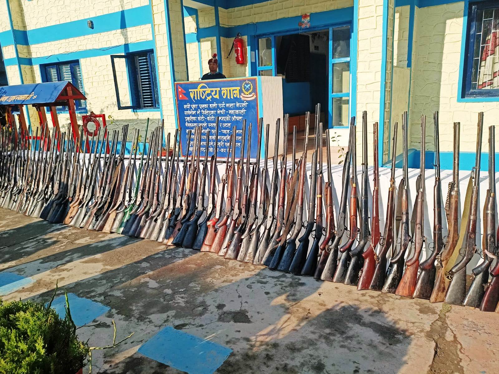 जिल्ला प्रहरी कार्यालयले जिल्लाको विभिन्न स्थानमा अवैध रूपमा लुकाइछिपाई राखिएको अवस्थामा एकसय भन्दाबढी अवैध भरुवा बन्दुकहरु बरामद गरेको हो । ग्रामीण क्षेत्रमा वन्यजन्तु जनावरहरुको चोरी, शिकारीमा प्रयोग भैरहेका बन्दुक फागुन २१ गते हुने आसन्न प्रतिनिधि सभा सदस्य पदको निर्वाचनलाई प्रभावित बनाउन सक्ने जोखिमलाई मध्यनजर गरी जिल्ला प्रहरी कार्यालयले सञ्चालन गरेको अवैध भरुवा बन्दुक खोज अभियान अन्तर्गत फेला पारिएको प्रनाउ थापाले बताउनुभयो ।