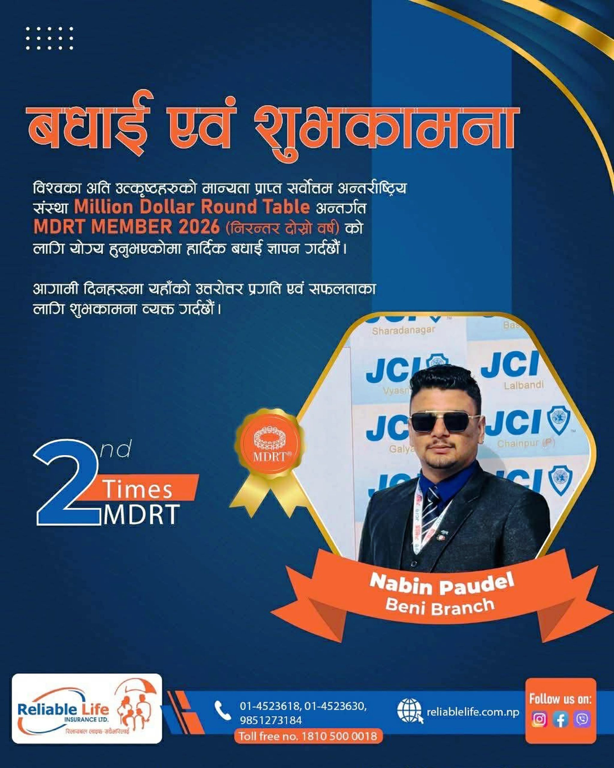 म्याग्दी– रिलायबल नेपाल लाईफ ईन्स्योरेन्स लिमिटेडको बेनी शाखा म्याग्दीका अभिकर्ता नवीन पौडेल एमडिआरटी विजेता बन्नुभएको छ । बीमा तथा वित्तीय सेवाको क्षेत्रमा विश्वकै प्रतिष्ठित अन्तर्राष्ट्रिय संस्था Million Dollar Round Table- MDRT अन्तर्गत सन् २०२६ का लागि पौडेल MDRT सदस्यता प्राप्त गर्न सफल हुनुभएको हो ।