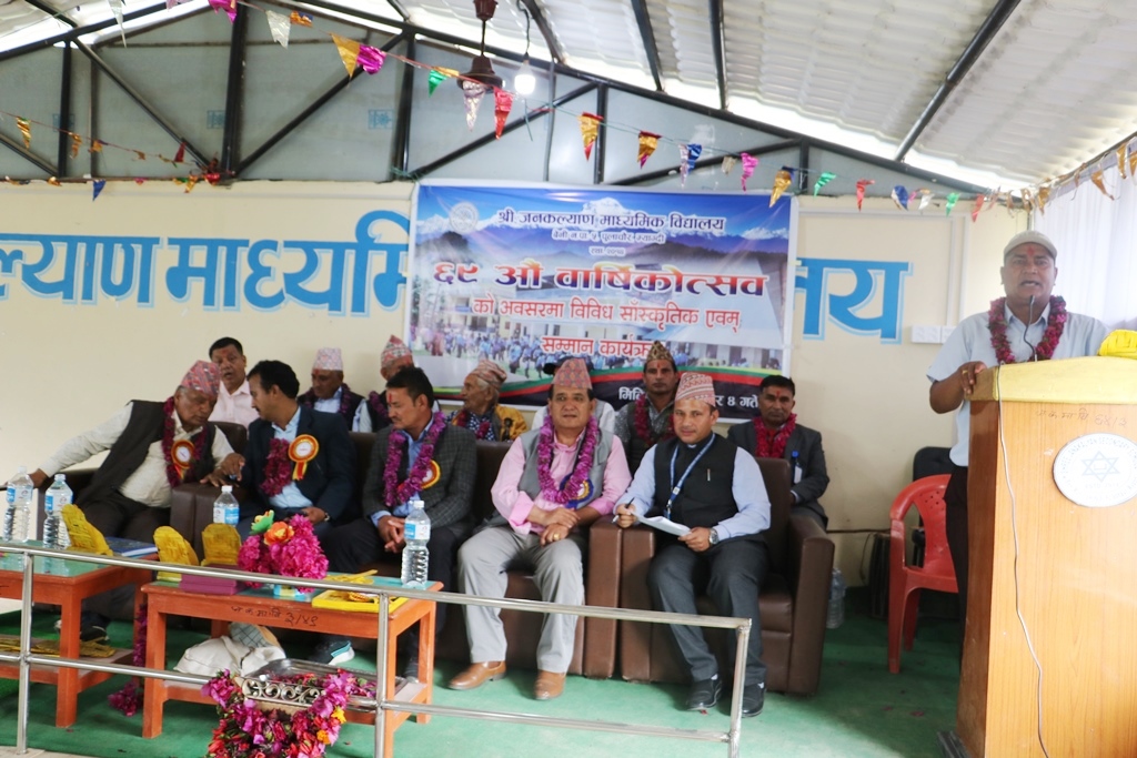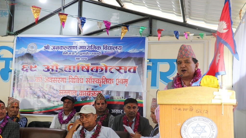 म्याग्दी– म्याग्दीको बेनी नगरपालिका–५, पुलाचौरमा सञ्चालित जनकल्याण माध्यमिक विद्यालयले बुधवार आफ्नो ६९औं वार्षिकोत्सव अर्थात् स्थापना दिवस मनाएको छ । विद्यालयको आयोजनामा विविध सांस्कृतिक तथा सम्मान कार्यक्रमको आयोजना गरी वार्षिकोत्सव मनाइएको हो ।
