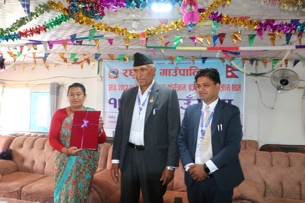 यसअघि गाउँसभामा गाउँपालिकाका अध्यक्ष भवबहादुर भण्डारीले प्रस्तुत गरेको आगामी आार्थिक वर्षको वार्षिक नीति तथा कार्यक्रम पारित भएसँगै उपाध्यक्ष प्रेमकुमारी पुनले आउँदो वर्षका लागि प्रस्तुत गरेको ५० करोड ११ लाख ४० हजार आठसय २० रुपैयाँको बजेट पनि पारित भएको रघुगंगा गाउँपालिकाले जनाएको छ । गाउँसभामा उपाध्यक्ष पुनले पेश गरेको रघुगंगा गाउँपालिकाको विनियोजन विधेयक–२०८२ पनि पारित भएको छ ।
