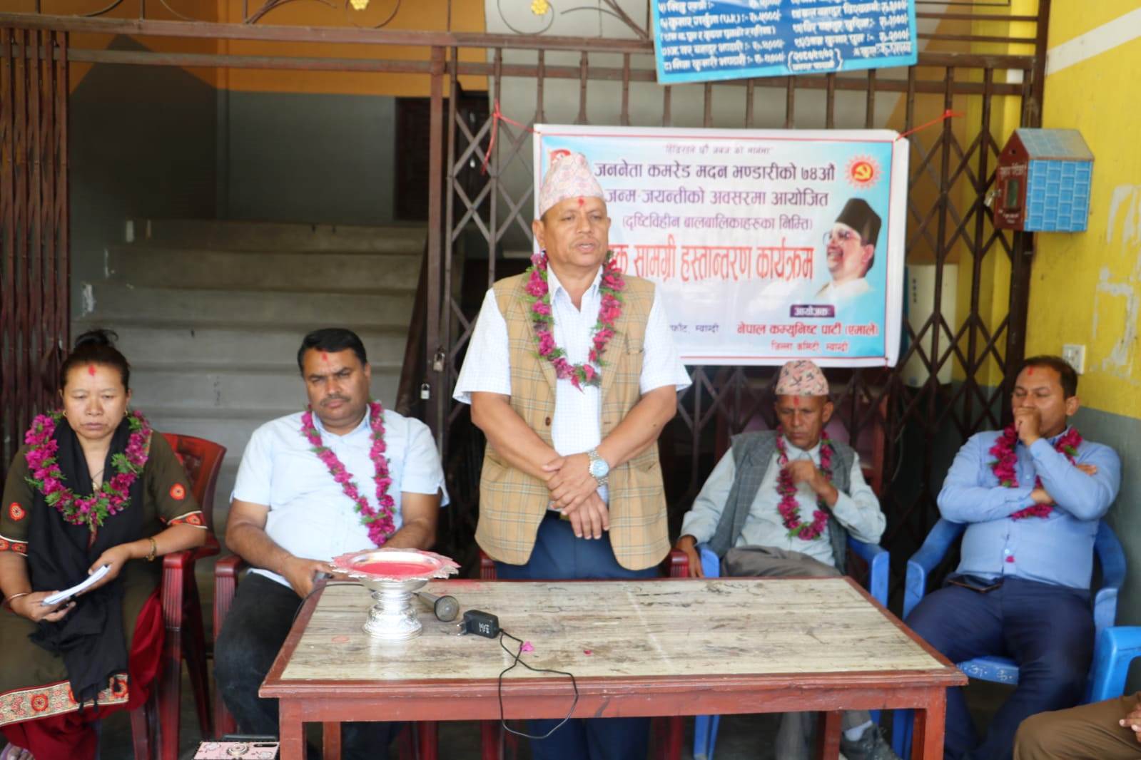 नेकपा एमाले म्याग्दीका अध्यक्ष बालकृष्ण सुवेदीले ज्ञानोदय माविमा अध्ययनरत दृष्टिविहिन विद्यार्थीहरुलाई थोरै भए पनि सहयोग पुगोस् भन्ने उद्देश्यले स्व. जननेता मदन भण्डारीको जन्मजयन्तीको अवसर पारेर आवश्यक सामग्री उपलब्ध गराइएको जानकारी दिनुभयो । कार्यक्रममा ज्ञानोदय माविको विद्यालय व्यवस्थापन समितिका अध्यक्ष हरिप्रसाद सुवेदीले मन्तव्य व्यक्त गर्नुभएको थियो । एमाले म्याग्दीका अध्यक्ष सुवेदीको अध्यक्षता र सचिव थमसरा पुनको सञ्चालनमा सम्पन्न कार्यक्रममा जिल्ला कमिटी सदस्य तथा कार्यालय सचिव हरिकृष्ण सुवेदीले स्वागत गर्नुभएको थियो ।