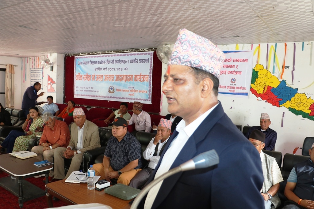 जिल्ला समन्वय अधिकारी निलकण्ठ शर्माले स्वागत गर्नुभएको कार्यक्रमको शाखा अधिकृत अमृत सुवेदीले सञ्चालन गर्नुभएको थियो । वार्षिक समीक्षा तथा असल अभ्यास आदानप्रदान कार्यक्रममा जिल्लास्थित सरकारी कार्यालय, स्थानीय पालिका, सरकारी तथा गैरसरकारी संघसंस्था र जिल्लामा कार्यक्षेत्र रहेका कार्यालयहरुको प्रस्तुतीकरणसहित समीक्षा सुरु भएको छ । समीक्षा कार्यक्रममा पहिलो प्रस्तुती जिल्ला समन्वय समितिको कार्यालयबाट सुरुवात गरिएको थियो ।