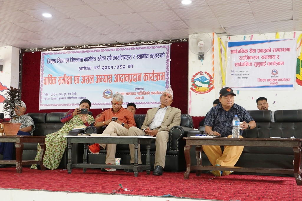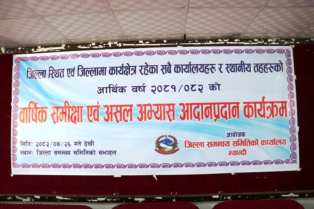 म्याग्दी– जिल्ला समन्वय समितिको कार्यालय म्याग्दीको आयोजनामा सोमबारदेखि सदरमुकाम बेनीमा वार्षिक समीक्षा तथा असल अभ्यास आदानप्रदान कार्यक्रम सुरु भएको छ । म्याग्दी जिल्लास्थित एवं जिल्लामा कार्यक्षेत्र रहेका सबै कार्यालयहरु र स्थानीय तहहरुलाई लक्षित गरेर वार्षिक समीक्षा आयोजना गरिएको हो ।